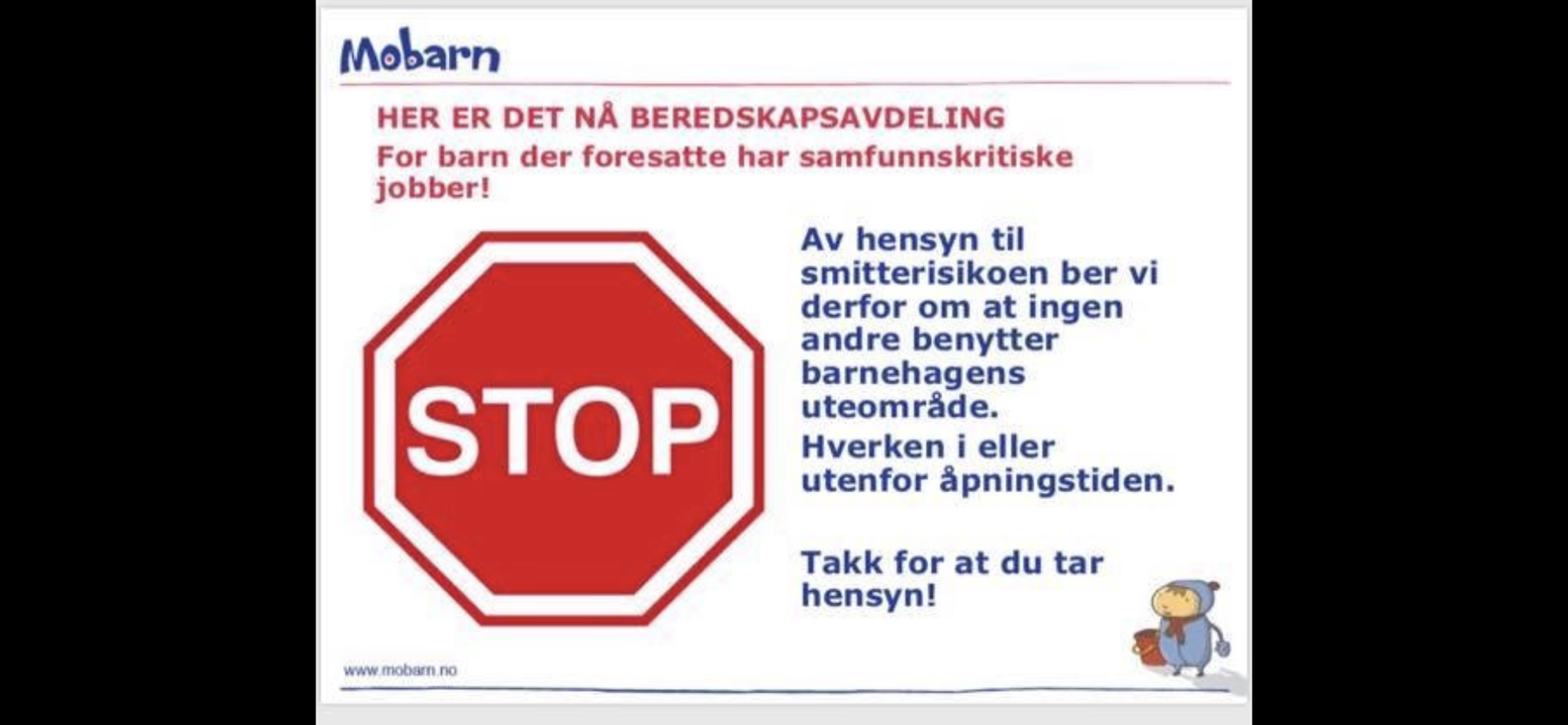 Uteområdet er stengt og kan ikke benyttes av noen, før barnehagen åpner igjen. Dette for å forebygge smitte.